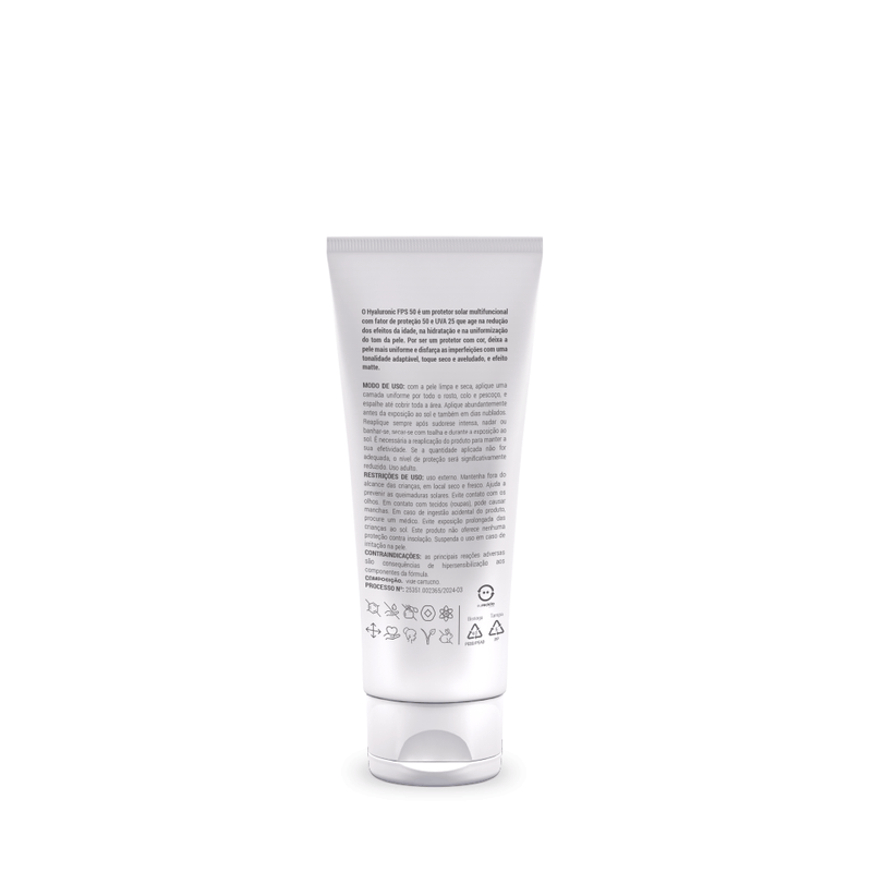 Protetor solar com cor e ácido hialurônico para uma pele mais uniforme e com menos sinais da idade. Proporciona proteção solar contra os raios UVA e UVB, uniformiza o tom da pele e tem efeito anti-idade, indicado a todos os tipos de pele. O Hyaluronic FPS 50 é um protetor solar multifuncional com fator de proteção 50 e UVA de 25 que também age na redução dos efeitos da idade, na hidratação e na uniformização do tom, proporcionando uma aparência saudável e jovial. Por ser um protetor com cor, deixa a pele mais uniforme e além disso tem efeito blur que disfarça as imperfeições como poros dilatados, tudo isso com uma tonalidade adaptável, toque seco e aveludado, e efeito matte. O Hyaluronic FPS 50 é um protetor solar com cor que estimula a produção de colágeno e ajuda na diminuição das rugas e linhas de expressão. Tem ainda ação antioxidante, prevenindo a formação de marcas escuras e iluminando a pele. Além de todos esses benefícios, o produto hidrata de forma intensa e fortalece as defesas naturais da pele sem pesar ou deixar um aspecto oleoso.