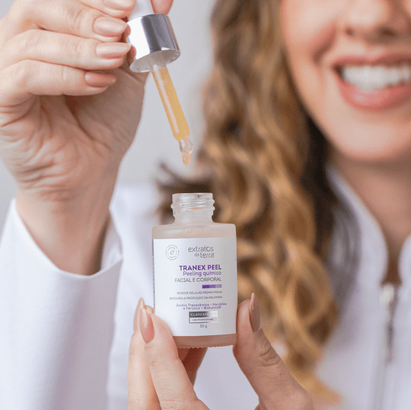 4. Tranex Peel Peeling clareador avançado com ácido tranexâmico. Atua diretamente na remoção de células pigmentadas e na prevenção de novas marcas escuras. Inibe a melanogênese e a cascata inflamatória, ao mesmo tempo em que fortalece a pele, melhora a luminosidade e promove uma limpeza celular profunda com ação rejuvenescedora.