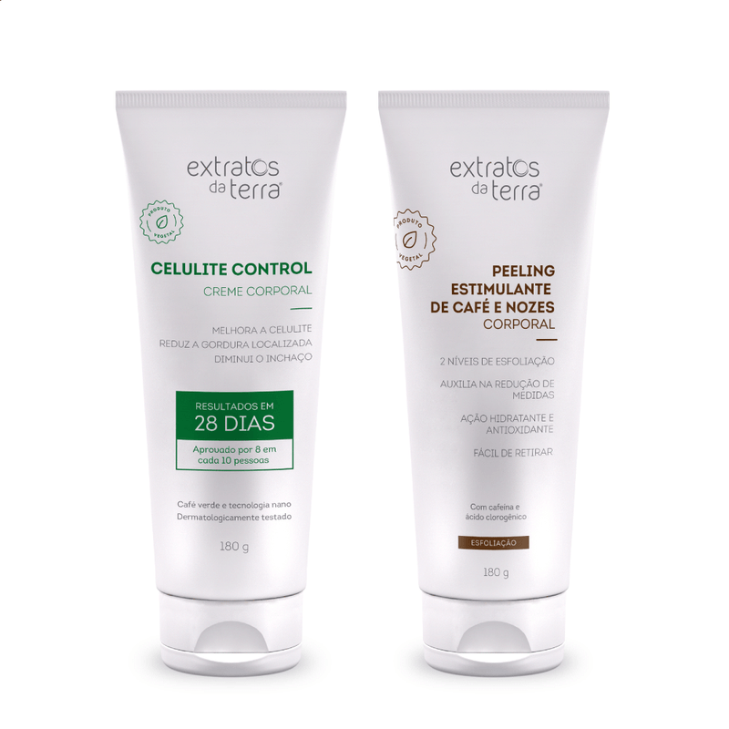 O kit redução de celulite da Extratos da Terra é a solução completa para quem busca reduzir a celulite e remodelar o corpo com eficácia. O kit inclui o Celulite Control, um creme poderoso contra a celulite e gordura localizada, e o Peeling Café e Nozes, que promove uma esfoliação profunda e estimula a circulação. Com resultados visíveis em até 28 dias, o uso regular do kit ajuda a suavizar o aspecto "casca de laranja", diminui o inchaço e deixa a pele mais firme e macia.