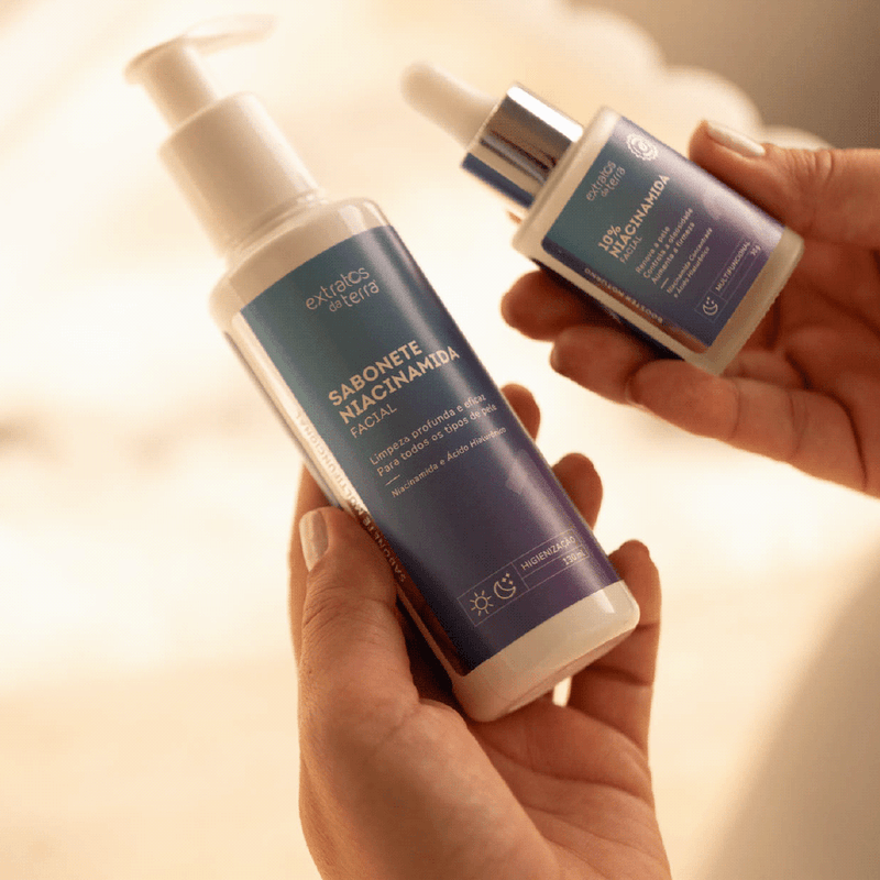 Já o sérum, desenvolvido com base vegetal e sem corantes, possui textura leve, secagem rápida e aplicação simples. Enriquecido com niacinamida pura concentrada e ácido hialurônico, é perfeito para uso noturno, proporcionando renovação da pele durante o sono.