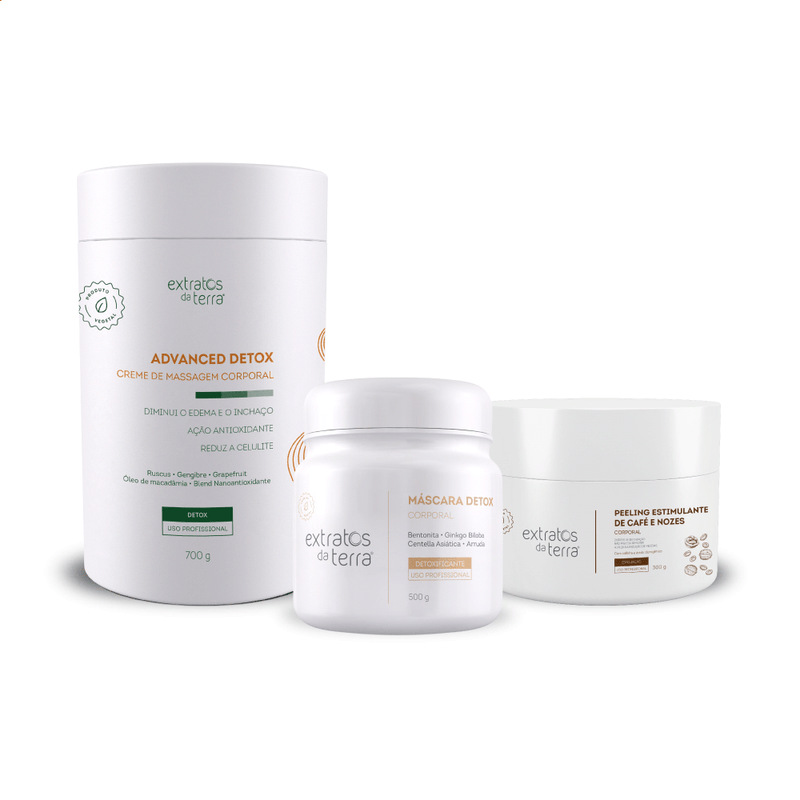 O que vem no kit: Peeling Estimulante de café e Nozes - 300g Máscara Detox - 500g Advanced Detox Creme de Massagem Corporal - 700g